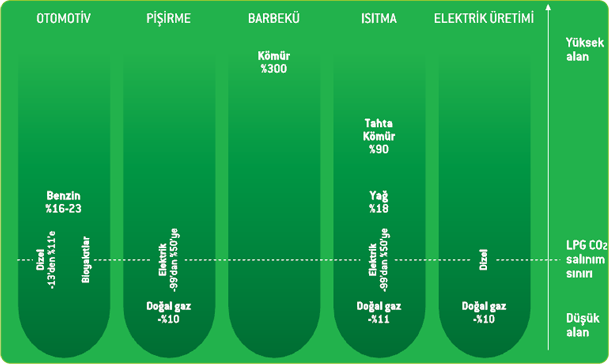 LPG, karbondioksit (CO2) salınımı açısından en temiz yakıtlardan biridir. Otomotiv yakıtı olarak, petrole göre çok daha az karbondioksit (CO2) salınımı sağlar.